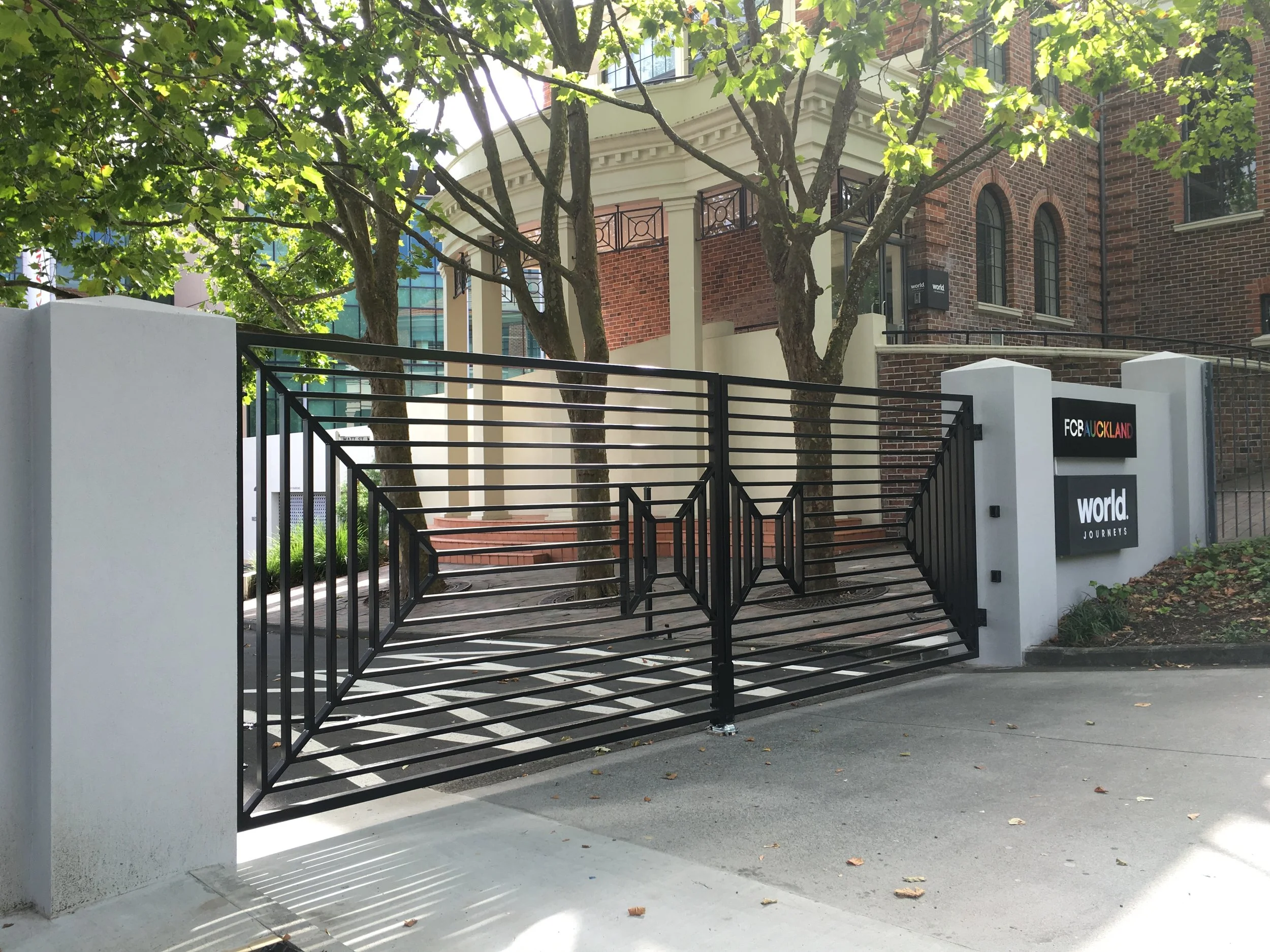 The design of the front gate and fence make a strong first impression of your business. In a commercial setting, the aesthetic must be balanced with the needs for high security and safety. Hampden creates amazing and creative fences and gates for business centers, supermarkets and shops that accentuate the brands of the businesses that they protect. Designs are developed in consultation with the owners and their architects. Show drawings are produced for sign-off, then the ideas start to take a physical form. Check out some of the results in the gallery below.